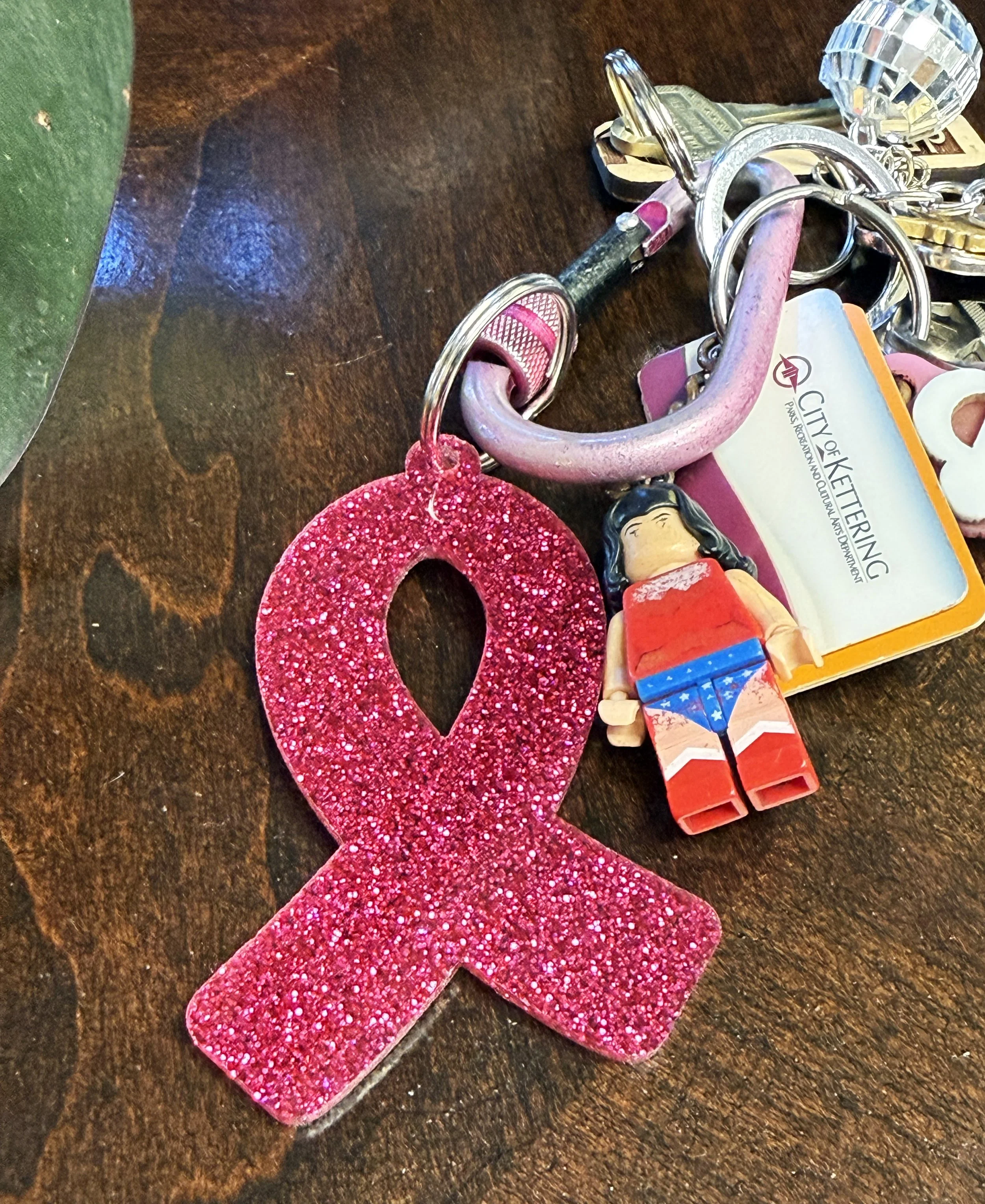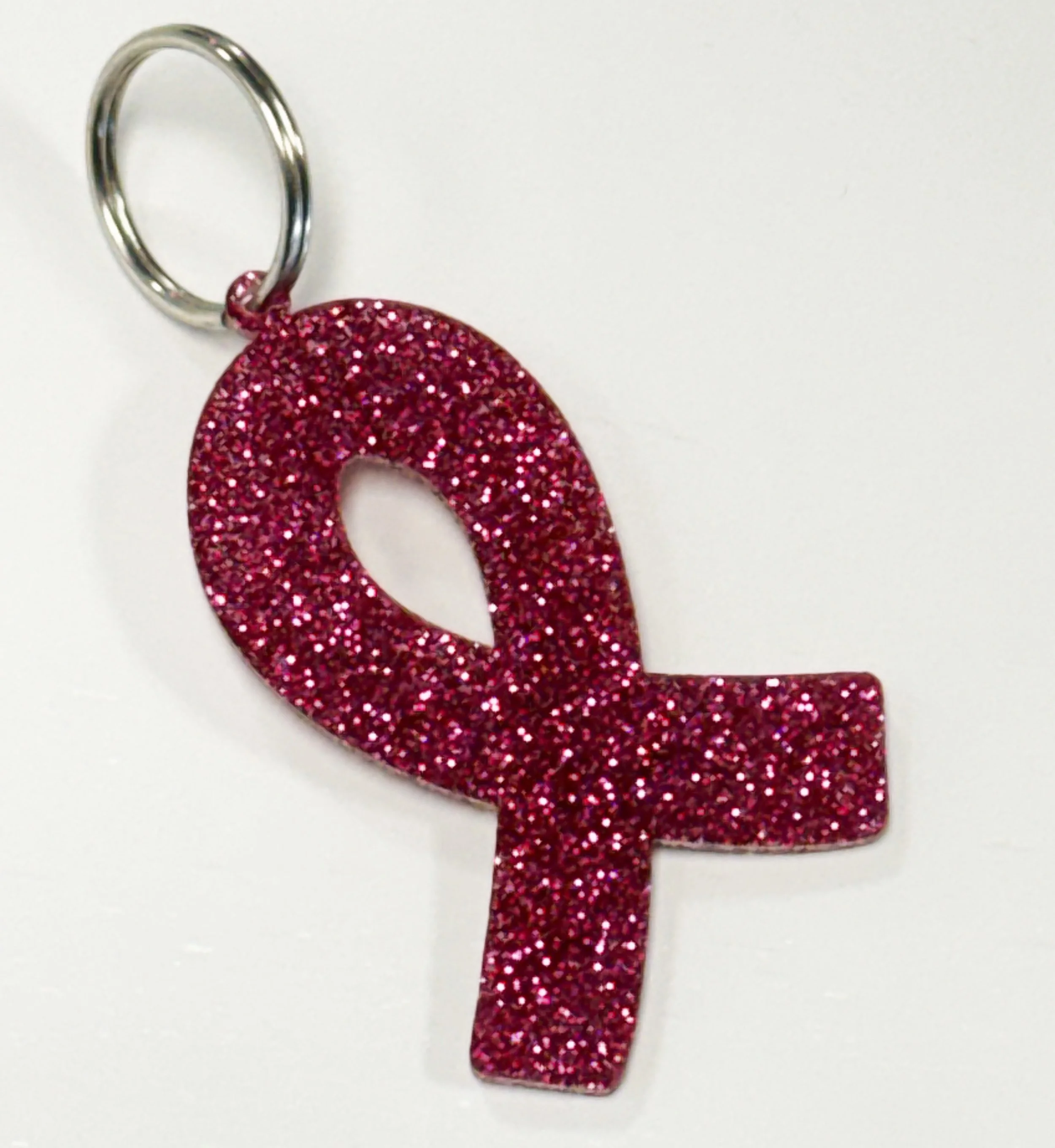 Never lose your keys again with this frosted pink ribbon key chain. The frosted pink acrylic is 2.5” tall. This is your reminder: Nobody Fights Alone!